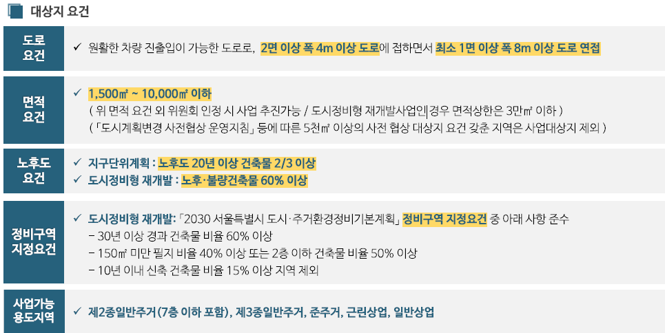 30년 이상 경과한 건축물 비율이 60% 이상이어야 하며 150㎡ 미만 필지 비율이 40% 이상 또는 2층 이하 건축물 비율이 50% 이상이어야 한다. 또한 10년 이내 신축 건축물 비율이 15% 이상 지역은 제외되며 위에 요건들을 동시에 충족되고 있는 지역이 대상지 선정 요건에 해당한다.