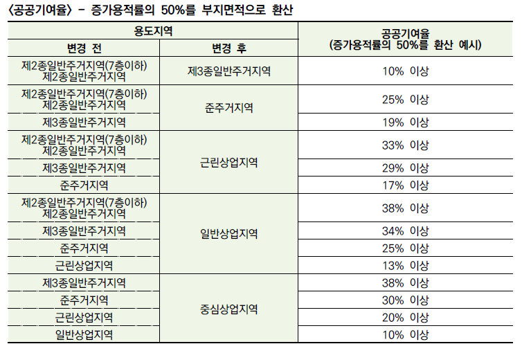 상향 조정된 용도지역으로 인해서 증가한 용적률 중 일정한 면적을 공공임대주택 또는 공공시설, 생활 서비스시설 등 공공에 필요한 시설 확충에 기여하고 증가한 나머지 용적률은 사업 수익으로 전환하는 것이다. 즉, 공공과 민간이 함께 진행하는 윈-윈 구조 사업이라고 할 수 있다.